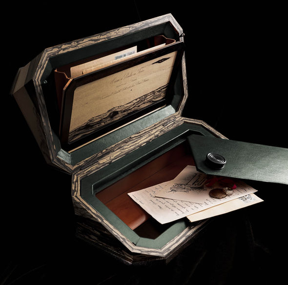 Le coffret comporte des doubles fonds dont l'un est fermé par un mécanisme secret, spécialement imaginé pour ce coffret.